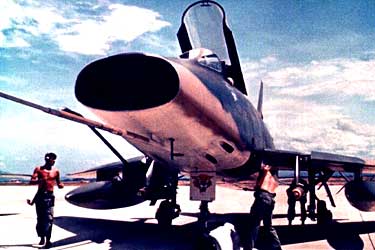 We practiced gunnery at the range near the base or at Mata Gorda Island off the Texas coast. Our primary mission was to deliver both conventional and nuclear weapons. The conventional weapons consisted of bombs, napalm, rockets, and the F-100's 20mm machine gun. We could also carry a nuclear bomb about the strength of those dropped on Japan in August 1945. We had an interesting delivery method for a nuclear bomb (practiced with 25# inert bombs). We would fly across the target at 500' above the ground and pull up into a half-looped manuever (called an immelman). We had to maintain a steady 4-Gs (4 times the force of gravity) on the aircraft; we wore G-suits to help keep the blood from pooling in the lower part of the body (to keep from blacking out). When we reached a near vertical climbing position at about 12,000' altitude, we released the bomb. It continued upward to approximately 20,000' before falling back to the target. We continued the top half of the loop until the aircraft nose was below the horizon. We would then roll rightside up and leave the area as fast as possible so as not to be caught in the nuclear blast. The time it took for the bomb to travel up the extra 8,000' and then its freefall of 20,000’ gave us our escape time. To qualify, our bombs had to fall within 1,500' of the target, which was close enough for a nuclear bomb. We could also do a high dive bomb method by diving from 30,000' and pulling out around 25,000' after bomb release, but this wasn't as accurate as the “over-the-shoulder” method. The F-100 had a fixed gunsight, so the delivery of all ordnance depended upon the pilot’s skill. High tech equipment such as computer gunsights were introduced late in the Vietnam war.