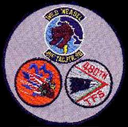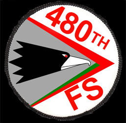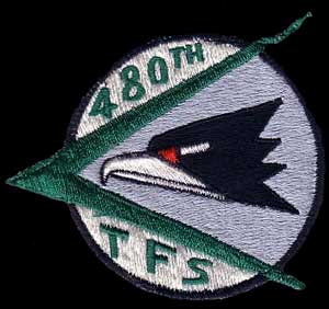 The shock wave indicates the high performance aircraft used by a USAF tactical fighter squadron. The green color of the shock wave and the white background reflects the squadron colors.